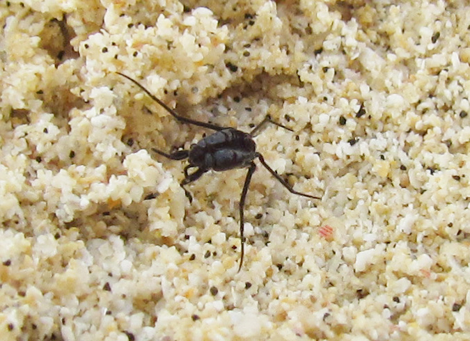 The tradewinds have been fairly strong lately, so this past Saturday I went for an early morning stroll along a beach a few minutes from where we live to see if I could find some Halobates. The genus Halobates consists of water striders (Gerridae) that live almost entirely in marine habitats and contains the only insect species living in the open ocean (The Marine Insect Halobates (Heteroptera: Gerridae): Biology, Adaptations, Distribution, and Phylogeney, Oceanography and Marine Biology: An Annual Review 2004, Nils Moller Andersen and Lanna Cheng 42:119–180).