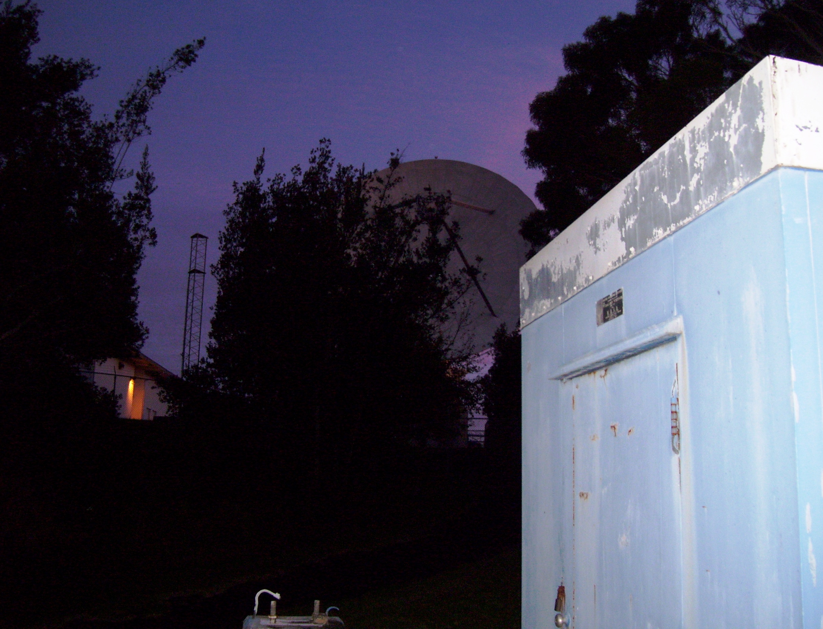 Earlier this year we conducted surveys for federally listed endangered Hawaiian Drosophila on land up in Kokee (Kauai) that the Navy manages. The sites are situated right against the critical habitat boundary, so we basically conduct our surveys along the fenclines and permiter of the property lines (this is the second year we have done these surveys). The last site in this area consists of a NASA facility with a giant antenna (access is prohibited, so there is a locked gate preventing unauthorized personnel from driving up to it). The big dish is pretty impressive, but I was more interested in the remnants of the previous antenna system that sit behind the current facility. There are some old footings and a small rusting blue structure labelled “Satan Antenna System”, complete with pitchfork logo. Evidently this stands for Satellite Automatic Tracking Antenna, and it dates back to the ’60s. While at the site, the remote feeling created by the combination of being in the middle of the forest and having an expansive view of the Pacific Ocean, together with standing in the shadow of a giant satellite dish that seemed to randomly come to life every 30 minutes and orient itself towards some unknown celestial target, tended to prompt the imagination to create images of what might be inside the little locked blue building…perhaps a long staircase into the darkness? Ernest Borgnine in a hooded robe?