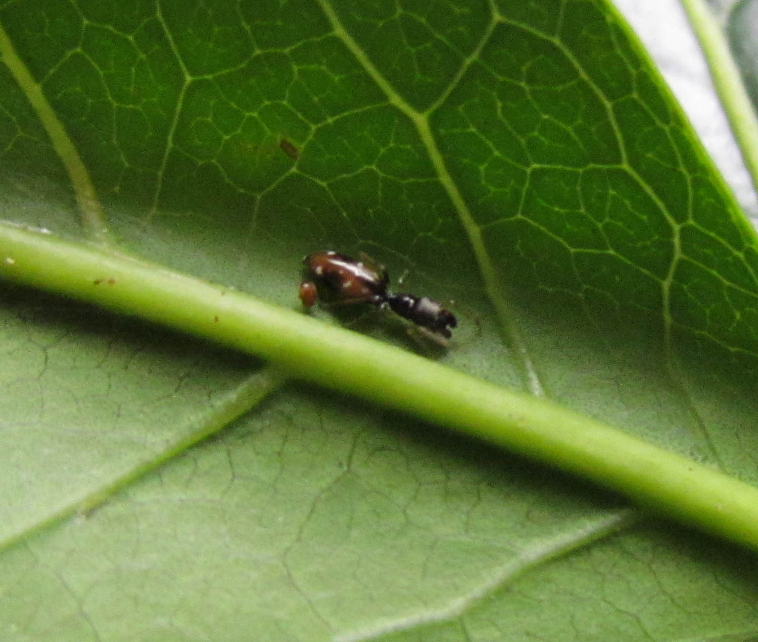 I had seen these Salticids on this same tree back in 2010, and at the time I inquiredabout them to the friendly entomologists at the Bishop Museum.  I’m not sure he would want me quoting him, but in Frank Howarth’s words, “It’s a male Siler sp. [Salticidae] and apparently still undetermined.  I’ve seen a specimen from Makua Valley.  It was recorded from Hawaii by J. Proszynski 2002. (Remarks on Salticidae (Aranei) from Hawaii, with description of Havaika – gen. nov. Arthropoda Selecta ,vol. 10 (3): 225-241, f 81.) from a damaged specimen collected in 1974 by Wayne Gagne in the Waianae Mts.”