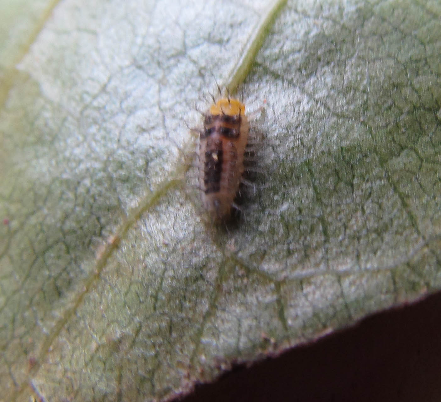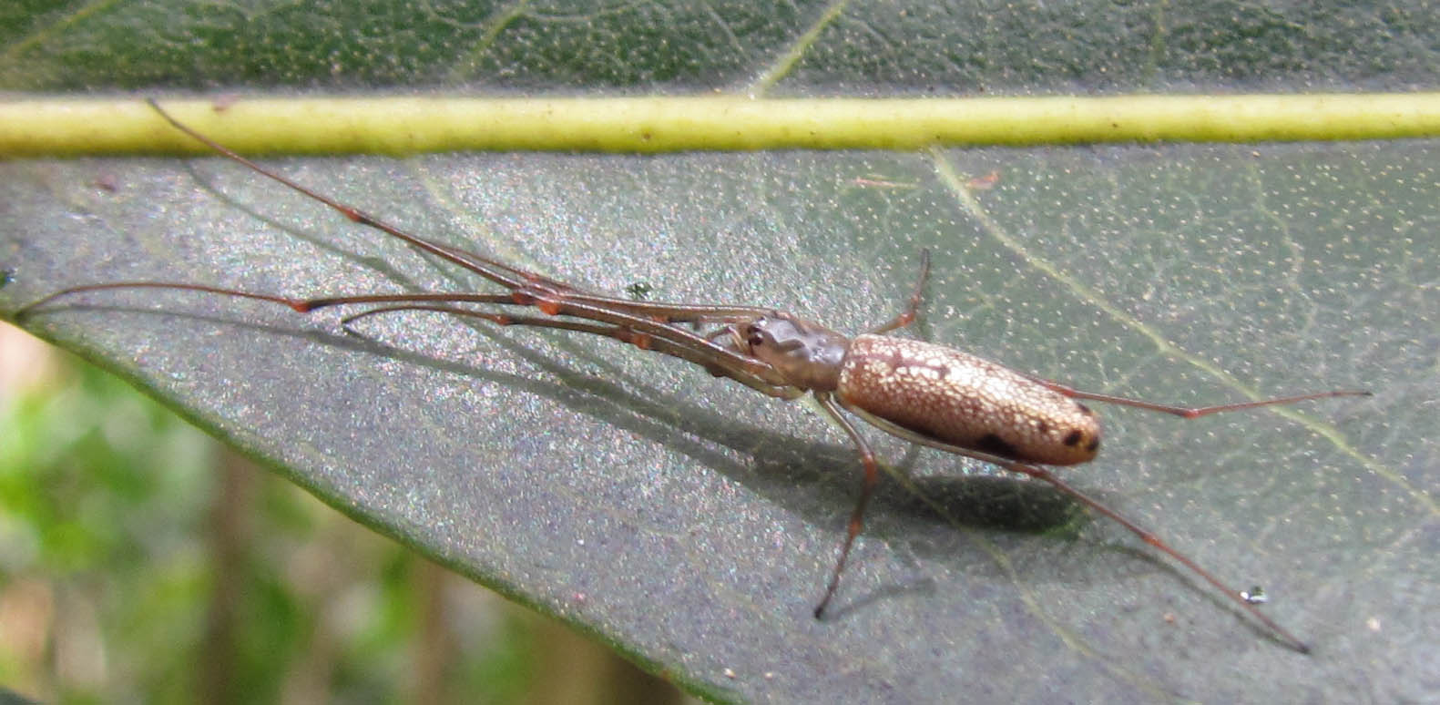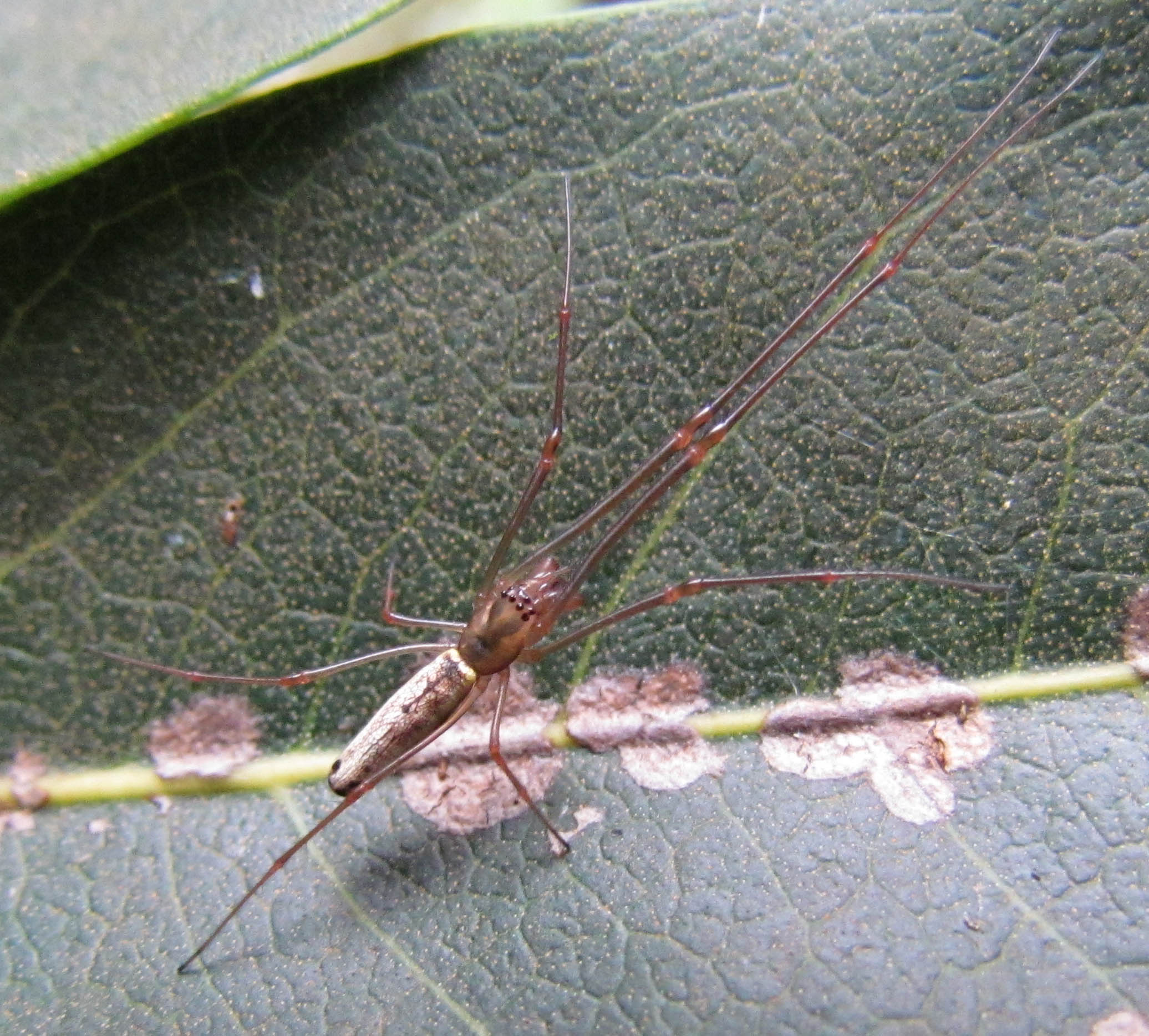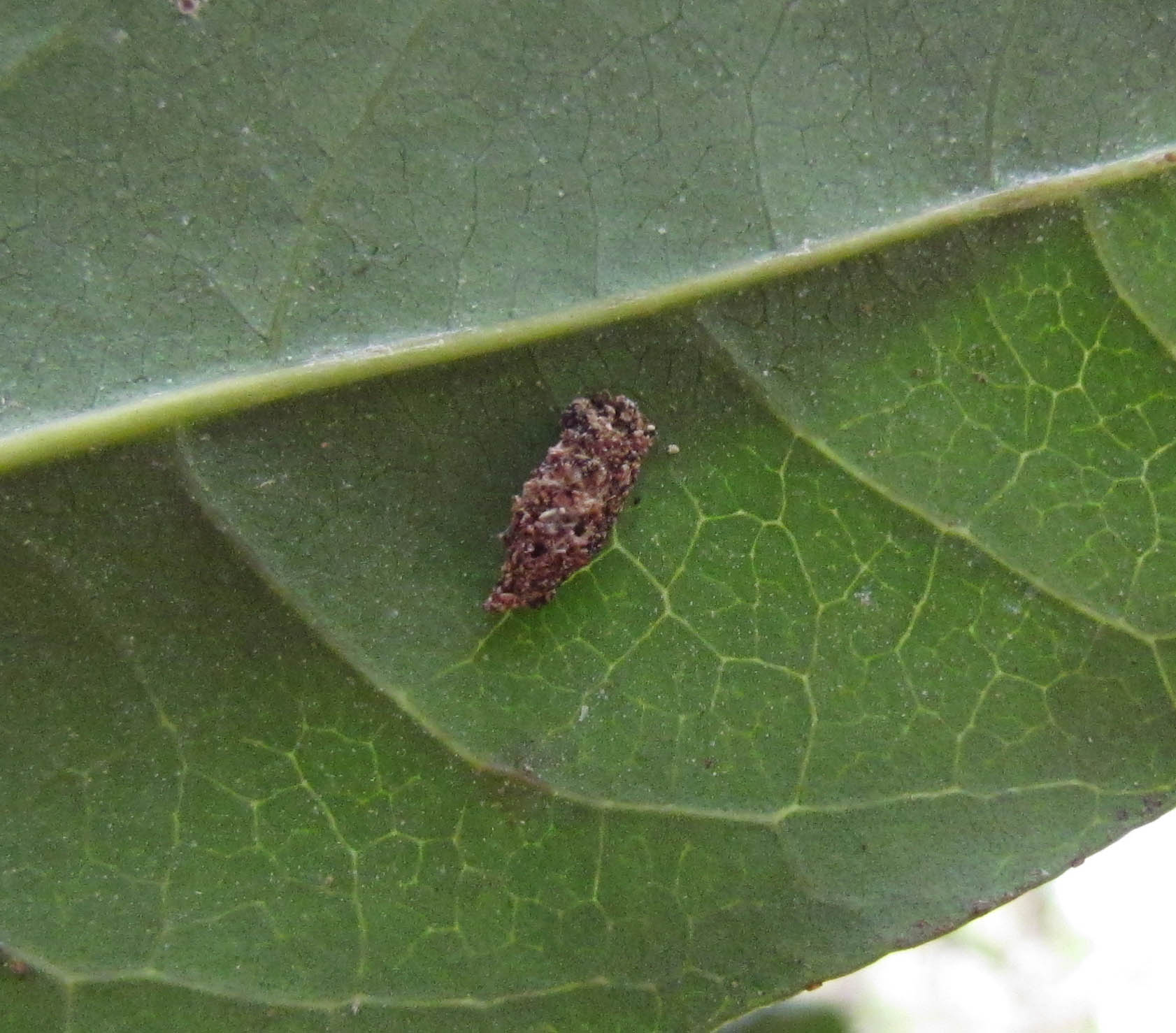 While I was there, I did some poking around on a  nearby Sapindus tree that usually hides some nice little treasures.  On the leaves I found Hyposmocoma, and, to my surprise, one appeared to have a parasitoid wasp lurking around its case.  This same small tree also had some interesting Tetragnatha spiders, some cool Salticids (ant mimics?), and some kind of beetle larvae (I think?).