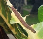 Found this little beastie munching on one of our croton plants the other day. Here in Hawaii it is aptly named the Croton Caterpillar, but I guess in other parts of the world it goes by the moniker “Castor Oil Semi-looper.” Don’t know much about this handsome insect, other than 1) the species name, Achaea janata (Linnaeus); 2) the family, Noctuidae; and 3) it eats crotons and evidently castor bean plants. I did manage to get a few mediocre pics, so here they are: