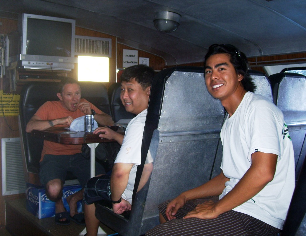 I was very concerned about getting sick, even though I had taken one Bonine pill in the morning, and another just after boarding the boat. I was doing fine, until we had to move a bunch of gear from the deck cabin down below to the cargo area. I was part of the chain down below, receiving luggage as it was passed from person to person down the stairs and through the narrow passage. By this time the boat was well under way and we had hit open ocean so the vessel was heaving to and fro. I started sweating profusely and began feeling a little uneasy. I didn’t get nauseated, but I was feeling very disoriented and my head ached. Standing outside on deck, with the cool air and ocean spray hitting me in the face, I was able to slightly recover. Soon it got dark however, so I retreated inside to try and find a seat.
